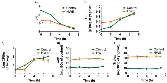Evolution of (a) pH, (b) titratable acidity (expressed as lactic acid equivalents (LAE)/100 g of fresh weight yogurt)), (c) Streptococcus thermophilus counts (Log CFU/g of fresh weight yogurt), (d) total polyphenolic content (mg gallic acid equivalents (GAE)/100 g of fresh weight yogurt), and (e) antioxidant activity (mg of Trolox/100 g of fresh weight yogurt) along the fermentation process for the control and supplemented yogurt with the HWE.