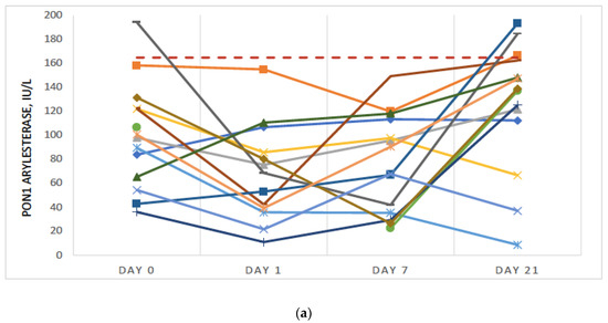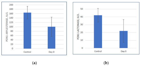 Ten of 14 subjects had a decrease in PON1 arylesterase activity (p = 2.60 × 10−2) and 9 of 14 had a decrease in PON1 lactonase activity (p = 8.57 × 10−2) Day 0 to Day 7 (Figure 2a,b). PON1 increased by Day 21 for most patients and in some cases, exceeded the control group averages, suggesting that improvement in PON1 may be associated with a reduction in acute inflammation. Some patients experienced a further decline in PON1 by Day 21, which may be associated with other comorbidities, late stage colorectal cancer and complications.