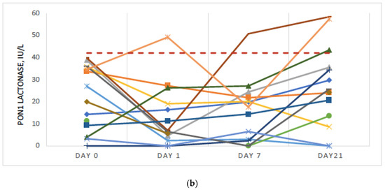(a) Paraoxonase 1 (PON1) arylesterase activity (IU/L) for individual patients. For comparison, the control group average is shown as a horizontal dotted line; (b) PON1 Lactonase Activity (IU/L) for individual patients. For comparison, the control group average is shown as horizontal dotted line.