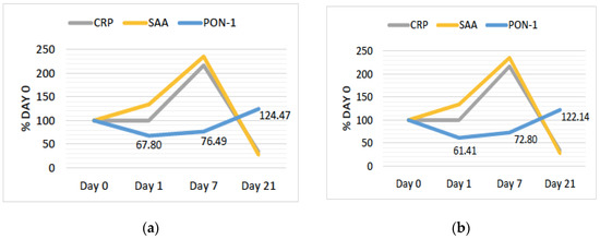 As shown in Figure 3a,b, changes in PON1 arylesterase and lactonase activity are negatively associated with changes in classic inflammatory markers. We noted a sharp decline in PON1 from Day 0 to Day 1 in the subacute phase. SAA, an inflammatory marker, increased in this same time period, with a further increase from Day 1 to Day 7, during which time PON1 levels begin to increase again. CRP, another inflammatory marker, remained stable in the subacute phase but sharply increased between Day 1 and 7. Between Day 7 and Day 21—the recovery phase—SAA an CRP decreased sharply and PON1 increased to an average activity level greater than Day 0. Furthermore, mean WBC counts increased from 6.8 × 103/μL to 10.2 × 103/μL from Day 0 to Day 7 and decreased to 5.2 × 103/μL by Day 21.