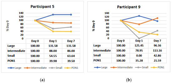 PON1 arylesterase and small, intermediate and large HDL as a percentage of Day 0 for (a) participant 5 (b) and participant 9.