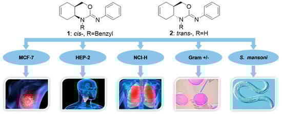- De Brito, M.R.M.; Peláez, W.J.; Faillace, M.S.; Militão, G.C.G.; Almeida, J.R.G.S.; Argüello, G.A.; Szakonyi, Z.; Fülöp, F.; Salvadori, M.C.; Teixeira, F.S.; et al. Cyclohexene-fused 1,3-oxazines with selective antibacterial and antiparasitic action and low cytotoxic effects. Toxicol. Vitro. 2017, 44, 273–279. [Google Scholar] [CrossRef]