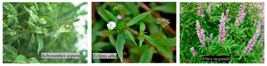 To determine the proximate and mineral composition, total phenolic contents (TPC), total flavonoid contents (TFC), antioxidant capacities (DPPH, ferric-reducing antioxidant power (FRAP) and trolox equivalent antioxidant capacity (TEAC)), and α-amylase inhibition activity, three wild plant samples were collected from different locations in Bangladesh. Two to three samples (300–600 g) were collected for each of the wild plants from every growing location. These were then mixed to make three analytes or composite test samples. The study samples were Achyranthes aspera L. (Upat Lengra), Eclipta alba L. (Kalokeshi), and Vitex negundo L. (Nirgundi). The samples were selected based on their traditional use, by interviewing local people, in treating diabetes. The identification of the samples was confirmed by a taxonomist of the Department of Botany, University of Dhaka, who accompanied the collection team, after examining the morphological characteristics. Photographs of these samples are shown in Figure 1. After collection, the leaves and roots of the samples were separated and gently washed with tap water immediately to remove sand and other extraneous material before being washed with distilled water and then air-dried. Then, the samples were cut into small pieces and freeze-dried (il Shin lab.Co. Ltd., Korea). The freeze-dried samples were ground and homogenized into a fine powder using a grinder. The homogenized samples were sieved to obtain an even particle size, then placed in an air-tight zipper bag and stored at −20 °C until further analysis.