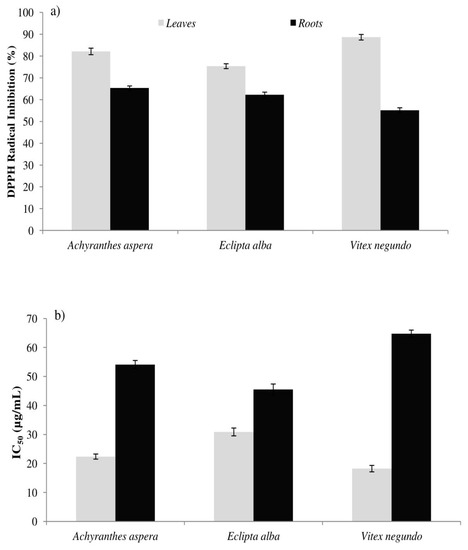 Figure 2 represents the % inhibition of the DPPH free radical (a) and IC50 value (b) of the leaf and root extracts. The highest DPPH inhibition (86.65% inhibition) was observed in the Vitex negundo leaf, while the root of the same species showed the lowest inhibition (55.15% inhibition). The leaf extracts showed more potent scavenging activity than their root counterparts (p < 0.001). Adedapo et al. [29] also observed a similar trend but only at higher concentrations of the extract. Antioxidant activity measured by DPPH assay in different vegetables available in the local market ranged from 0.61 to 8328.80 µmol trolox equivalent per gram [33]. At 100 µg/mL, Adedapo et al. [29] noticed an 89.7% and 67.0% inhibition of DPPH by the leaf and stem of a South African medicinal plant, respectively, while Shahat et al. [31] recorded almost 100% inhibition of DPPH by Asteraceae family plants. Dasgupta & De [7] reported IC50 values of some leafy vegetables in India, measured by DPPH assay, ranging from 61.4 to 1946 µg/mL, which are higher values than what we observed in this study.