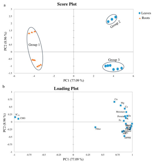 Figure 4a,b represents the score and loading plots of analyzed variables of the plant samples, respectively. In Figure 4a, a clear separation between the leaves and roots of the analyzed sample was observed. Also, in Figure 4a, the formation of three groups can be seen. Group 1 consists of roots of Vitex negundo, Achyranthes aspera & Eclipta alba. Groups 2 & 3 consist of leaves of Eclipta alba, and Achyranthes aspera & Vitex negundo, respectively. IC50 and CHO variables contributed mostly to the separation of group 1, moisture, protein and all of the minerals except sodium for group 2, and TPC, TFC, α-amylase, antioxidant activities (DPPH, FRAP & TEAC), sodium, fat, protein, ash and fiber for group 3.