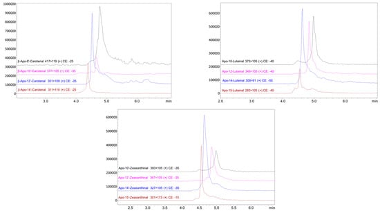 | Apo-10’-Zeaxanthinal-C12:0 | 574 | + 575>105 (−35) | + 575>119 (−30) | 75 |