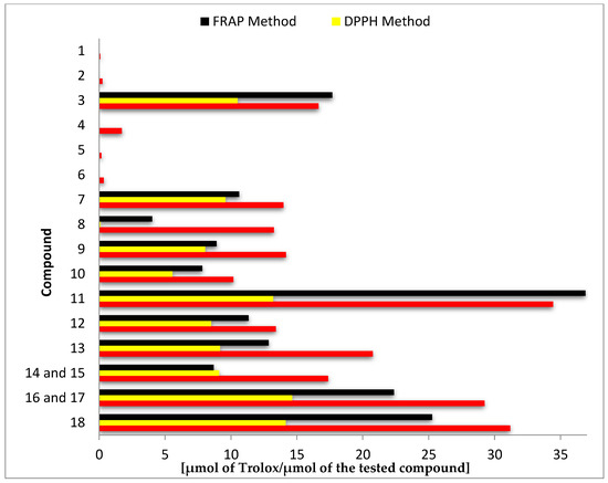 Antioxidant activity of tested compounds (1–18) determined in separate tests: ABTS, DPPH, and ferric ion reducing antioxidant power (FRAP).