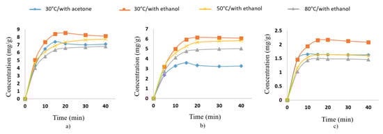 The influence of extraction time, temperature and solvent on the UAE of chlorophylls and carotenoids from Brassica oleracea was studied in order to optimize the conditions of extraction. Acetone and ethanol were chosen as extraction solvents because these solvents were often used for the extraction of food pigments []. Ethanol revealed a better efficiency for chlorophyll (Figure 2a,b) and carotenoid extraction (Figure 2c). Consequently, ethanol was chosen as the solvent for extraction of target compounds from broccoli and from samples obtained after the simulated digestion experiment. Ethanol was also preferred because of its recommendation as an eco-friendly and safe solvent and the possible applications of the extracts in food or pharmaceutical industries [].