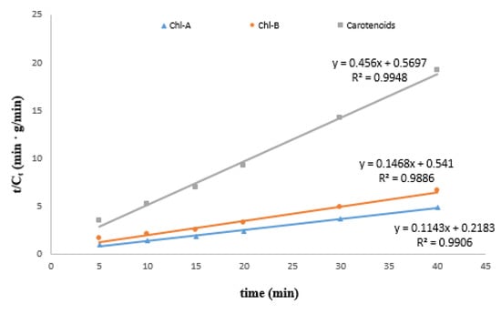 The experimental data from the UAE of Chl-A, Chl-B and carotenoids from broccoli at 30 °C using ethanol were processed and plotted in the specific coordinates of the second-order kinetic model (Figure 3).