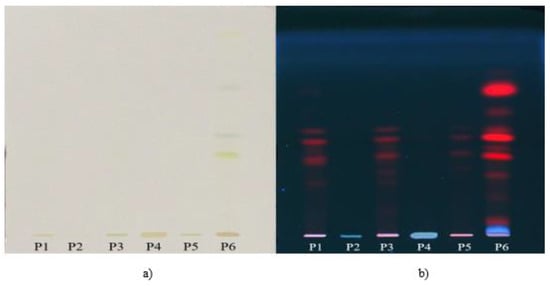 The changes occurring in the content of chlorophylls and carotenoids before and after each step of in vitro digestion was also evaluated by TLC. The extracts—salivary phase digesta (P1), gastric phase digesta (P2), gastric ethanolic extract (P3), intestinal phase digesta (P4), intestinal ethanolic extract (P5) and non-digested ethanolic extract (P6)—were analyzed by TLC and a decreasing trend in chlorophyll and carotenoid content after in vitro digestion process was observed. The chromatograms were visualized in visible light (Figure 4a) and UV light at 366 nm (Figure 4b).