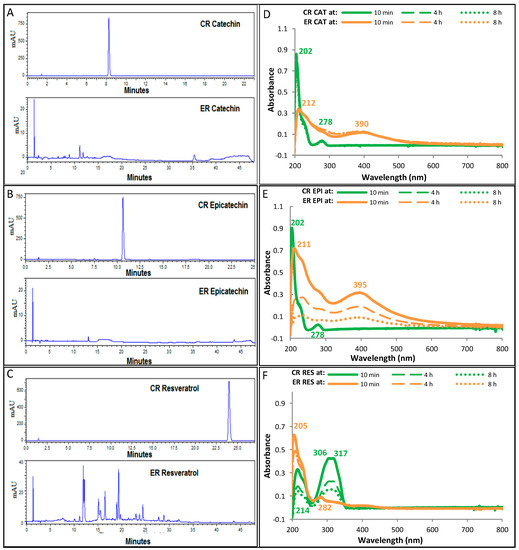 Reversed phase high performance liquid chromatography (RP-HPLC) chromatograms of the control reaction (CR) and enzymatic reaction (ER) with (A) catechin (CAT), (B) epicatechin (EPI), and (C) resveratrol (RES), at 10 min of reaction. The graphs (D–F) show the ultraviolet-visible (UV-Vis) absorption spectra of the CR and ER with each polyphenolic compound at different reaction times. Concentrations of phenolic compounds (PCs), peroxidase, and hydrogen peroxide (H2O2) in the reaction medium of the ER were 1.5 mM, 2.5 U/mL, and 0.05%, respectively. In the CR, peroxidase was substituted by phosphate buffer solution. mAU: milli arbitrary area units.