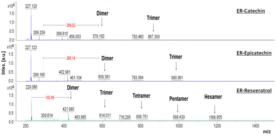 Molecular weight distribution in the enzymatic reaction (ER) with catechin, epicatechin and resveratrol. Mass spectra obtained through Matrix-Assisted Laser Desorption/Ionization Mass Spectrometry (MALDI-TOF-MS) with amplification from 150 to 1500 m/z. The samples were obtained from the ER medium after 30 min from the start of the reaction. The concentrations of phenolic compounds (PCs), peroxidase, and hydrogen peroxide (H2O2) in the reaction medium of the ER were 1.5 mM, 2.5 U/mL, and 0.05%, respectively.