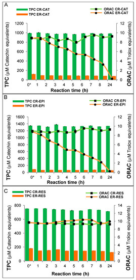 The TPC in the control reactions (CRs) with catechin, epicatechin and resveratrol did not show significant differences throughout the reaction time (Figure 3A–C, clear bars), while the TPC, in the enzymatic reactions (ERs) (Figure 3A–C, dark bars), decreased drastically from the beginning of the reaction with respect to CRs. Considering the TPC values in the CRs at time 0 and those in the ERs at 24 h, it is possible to observe a decrease of 92%, 96%, and 98% in the TPC, in the reactions with catechin, epicatechin and resveratrol, respectively. The antioxidant capacity of the CRs with catechin, epicatechin, and resveratrol (Figure 3A–C, lines with squared markers), assessed by the ORAC method, did not show significant difference throughout the reaction. The antioxidant capacity in the ERs (Figure 3A–C, lines with circle markers) decreased gradually with progress of the reaction. However, considering the TPC of the CRs and ERs, it is noted that the antioxidant capacity of the products of the ERs is higher than that observed in the CRs. For example, after 1 h of reaction, the TPC of the CR of catechin was 1005.3 ± 8.3 μM CE, while the TPC of the ER significantly decreased up to 95.1 ± 0.4 μM CE. Nevertheless, no significant differences in antioxidant capacity were observed, since 8.7 ± 0.1 μM TE was the result with monomers (CR) and 8.9 ± 0.1 μM TE was obtained with oligomers (ER). Hence, the antioxidant capacity of the oligomers was about ten times higher than that of the monomers. In the reactions with epicatechin, the effect of polymerization on the antioxidant capacity was higher, since after 1 h of reaction, the TPC of the CR was 1348.2 ± 2.5 μM CE, while the TPC of the ER significantly decreased to 65.8 ± 0.7 μM CE, yielding 8.8 ± 0.2 μM TE with the monomers (CR) and 8.1 ± 0.2 μM TE with the oligomers. So, the antioxidant capacity of the epicatechin oligomers was about 20 times higher than that of the monomers. In the CR and ER of resveratrol, no significant differences were observed in the antioxidant capacity; however, significant differences were observed in the TPC obtained throughout the corresponding reactions. The antioxidant capacity of the oligomers of resveratrol was approximately five times higher than the antioxidant capacity of resveratrol monomers.