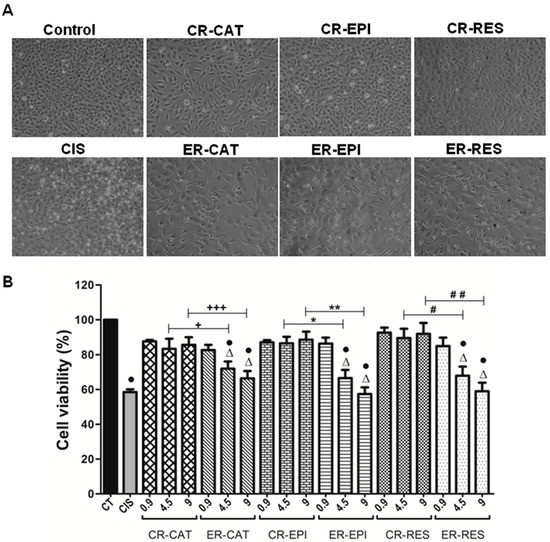 Cell damage in T24 bladder cancer cells induced by cisplatin and the products of the control (CR) and enzymatic (ER) reaction of catechin (CAT), epicatechin (EPI), and resveratrol (RES). (A) Representative images (10×) of the T24 cells’ density obtained by phase contrast microscopy and (B) cell viability of T24 cells assessed by the 3-(4,5-dimethylthiazol-2-yl)-2, 5-diphenyltetrazolium bromide (MTT) assay after different treatments after 24 h. T24 cells were treated for 24 h with cisplatin (10 mM CIS) or with different concentrations (0.9, 4.5 and 9 μM CE) of the CR and enzymatic ER of CAT, EPI, and RES. Control (CT) cells were treated for 24 h with 2% dimethyl sulfoxide (DMSO). Data are mean ± SEM, n = 3. • p < 0.05 vs. CT, + p < 0.0229 CR-CAT vs. ER-CAT (4.5 μM), +++ p < 0.0001 CR-CAT vs. ER-CAT (9 μM), * p < 0.0381 CR-EPI vs. ER-EPI (4.5 μM), ** p < 0.0018 CR-EPI vs. ER-EPI (9 μM), # p < 0.0144 CR-RES vs. ER-RES (4.5 μM), ## p < 0.0076 CR-RES vs. ER-RES (9 μM). ∆ Non-significant difference at p < 0.05 ER-CAT, ER-EPI, and ER-RES vs. CIS.