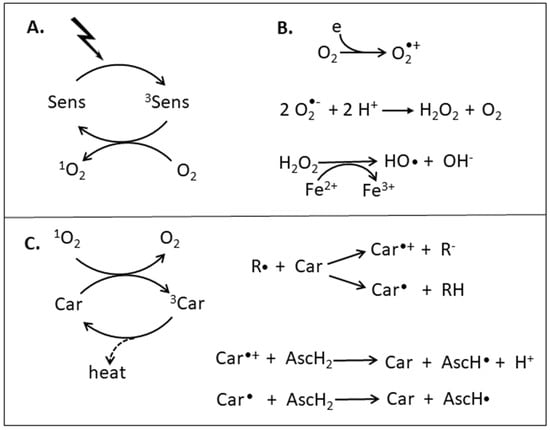 Formation of reactive oxygen species and their reaction with carotenoids. (A) Photosensitized formation of singlet oxygen, (B) radical formation, (C) reactions of carotenoids with singlet oxygen or radicals and regeneration by ascorbate.