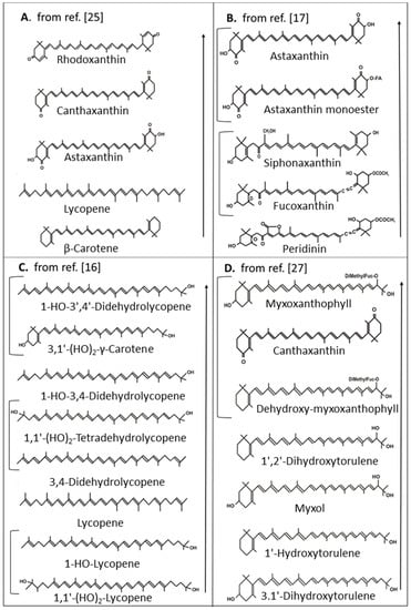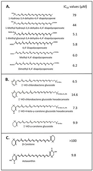 IC50 values of carotenoids as 1O2 quenchers assayed according to []. (A) C30 4,4’-diapolycopene derivatives [,,,], (B) monocyclic carotenoids [], (C) astaxanthin and β-carotene for comparison [].