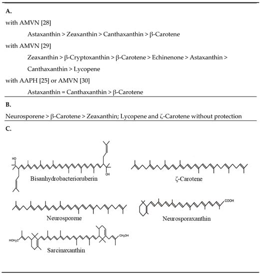 Protection by carotenoids against peroxyl radicals (A), against UV with α-terthienyl as the sensitizer (B), carotenoid structures mentioned in Section 3.1 and not shown in other figures (C). AMVN: 2,2′-azobis(2,4’-dimethylvaleronitrile; AAHP: 2,2’-azo-bis(2-amidinopropane) hydrochloride.