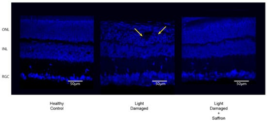 Nuclear staining (DAPI) of Control (left), Light damaged (center) and Light damaged treated with Saffron (right). Rosettes in LD are indicated with arrows. Images are taken in corresponding dorsal regions near the “hot spot”. ONL = outer nuclear layer; INL = inner nuclear layer; RGC = retinal ganglion cell layer.