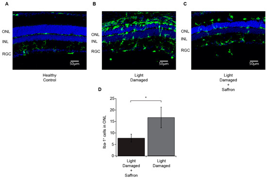 Microglia (in green) in Healthy Control (A), Light damaged (B) and Light damaged + Saffron (C) groups. In Healthy animals, microglia are resident in the inner retina and are absent in the outer nuclear layer (ONL) (A). Following light damage, resident microglia from the INL and invading microglia from the choroid migrate into the outer nuclear layer (ONL) (B). Saffron treatment significantly reduces the amount of microglia in the outer nuclear layer (ONL) after light damage compared to the untreated group (C). Number of microglia quantified, on average, in each field in the outer nuclear layer (ONL) (D). The mean ± SE is reported. (p < 0.05). Images taken in corresponding dorsal region “hot spot”. ONL = outer nuclear layer; INL = inner nuclear layer; RGC = retinal ganglion cell layer.
