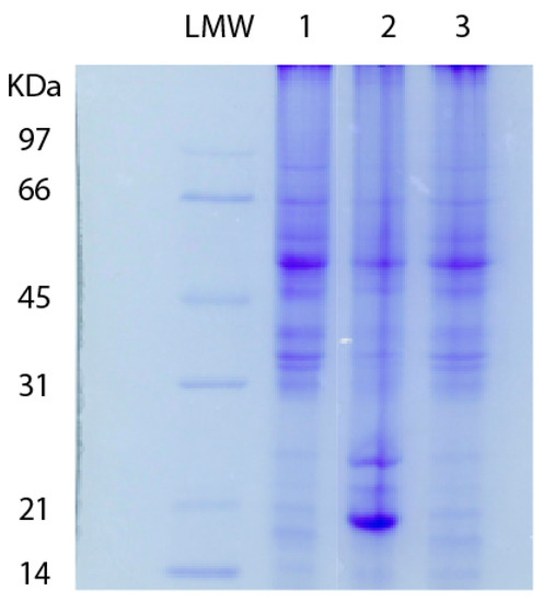 - Laemmli, U.K. Cleavage of Structural Proteins during the Assembly of the Head of Bacteriophage T4. Nature 1970, 227, 680–685. [Google Scholar] [CrossRef] [PubMed]