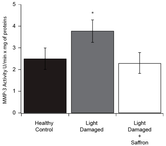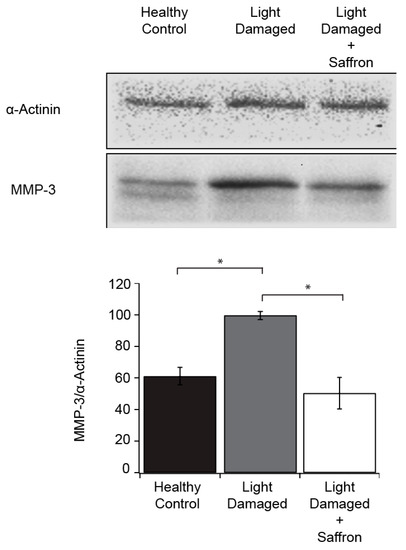 We performed western blot analysis as well as enzymatic activity assay and immunostaining to verify whether a relationship exists among light damage, saffron supplementation and MMP-3 regulation. Immunoblot analysis showed that MMP-3 expression was upregulated during light damage, and this increase was suppressed by treatment with saffron (Figure 4). The reduction was statistically significant.