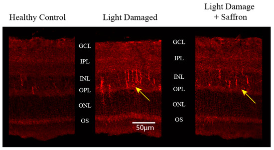 To define the retinal localization of MMP-3, an antibody immunofluorescence analysis was performed. MMP-3 immunoreactivity was detected in thin, radial processes in the inner nuclear layer of the superior retina, likely in the Müller cells, in both groups exposed to light damage (Figure 6), but in treated animals the number of processes decreased.