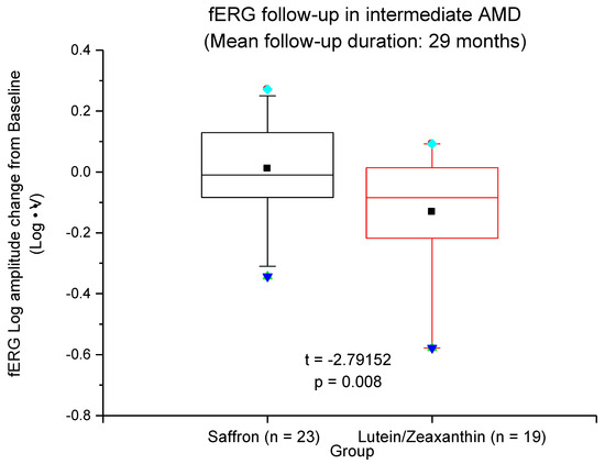 fERG Log amplitude change from baseline is reported for two groups of patients treated either with Saffron or Lutein/Zeaxanthin. Box plots showing the mean (closed squares), median (horizontal line), interquartile range (box), upper and lower 95% percentiles (error bars), upper and lower 99% percentiles (blue square and triangle, respectively) of the distribution of the fERG log amplitude changes from baseline in Saffron- and Lutein/Zeaxanthin-treated AMD patients. The difference between the two groups was highly significant (independent t-test).