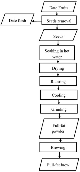 Date seeds were manually removed from palm date fruit (Sukkari cultivar) which were bought from a well-known market in Riyadh, Saudi Arabia. The seeds (1 kg) were well cleaned by using hot water. Then according the procedure used by Fikry, et al. [19], the seeds were roasted in a laboratory oven (Memmert, UN, Germany) at different roasting temperatures (160, 180 and 200 °C) for 10, 20 and 30 min. These roasting conditions were selected based on those usually used in conventional roasting. To obtain the seeds powder, the roasted seeds were preliminary crushed using a cutting grinder (RT-CR30S, 2007, Taiwan) with 2 mm sieve. The crushed samples were ground by using a hammer mill (Perten, 120, Klaukkala, Finland) equipped with 80-µm sieve. By following the procedure used by Nicoli, et al. [24], the brew was prepared by mixing the powder with a hot water at a ratio of 1:10 w/w. Then, the mixture was filtered using Whatman No. 2 filter paper (No. 2, ADVANTEC, Tokyo, Japan). Production flow chart of the brew from the full-fat roasted date seeds was drawn in Figure 1. The extracts were stored in glass bottles at −20 °C for further analysis.