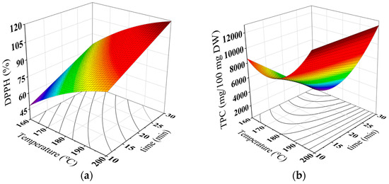 Table 3 illustrated that the TPC of the brew was a function of the roasting temperature with the linear, quadratic and interaction effects. These effects were previously noticed for sesame seeds extract [45], coffee-like maize beverage [30] and carob powder brew [21]. It was suggested that the roasting process could cause evaporation of intracellular water, triggering chemical reactions that may change the lignocellulosic structure and promotes protein denaturation, which may result in a greater availability of the phenolic compounds in the matrix [45]. Also, the increase in the TPC of the brews could be attributed to the formation of Maillard reaction products with phenolic type structure during the roasting process [21,46]. This explanation could be supported by the positive correlation found between BI and TPC (Table 5). Figure 3a,b were plotted using the proposed model (Equation (2)) to describe the changes in DPPH radical scavenging activity and TPC of the brew under different roasting conditions. Table 4 summarizes the regression coefficients of the second−degree polynomial models for the DPPH radical scavenging activity and TPC of the brew.