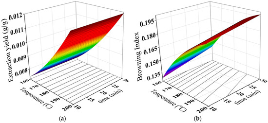 Statistical analysis showed that the BI of the brew was affected linearly and quadratically by the roasting temperature and time (Table 3). The predicted values of extraction yield, pH and BI can be concluded from Figure 4a–c. Also, the regression coefficients of the proposed models can be found in Table 4.