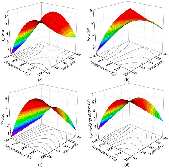 Table 6 revealed that the highest color score of the full-fat brew was 6.40 for a roasting temperature of 200 °C and a roasting time of 10 min. Obviously, Table 6 showed that the color score increased and then decreased as the roasting temperature and time increase. As it can be seen from Table 7, the color scores of the full-fat brew were linearly and quadratically related to the roasting temperature and time. Besides, the interaction effect between the temperature and time was found to be significant. It is interesting to observe that the changes in accepting the color of the brew could be due to the increase of BI which was resulted from Maillard reactions [37]. Table 5 indicated that there is a positive relationship between BI and the sensory color of the brew.