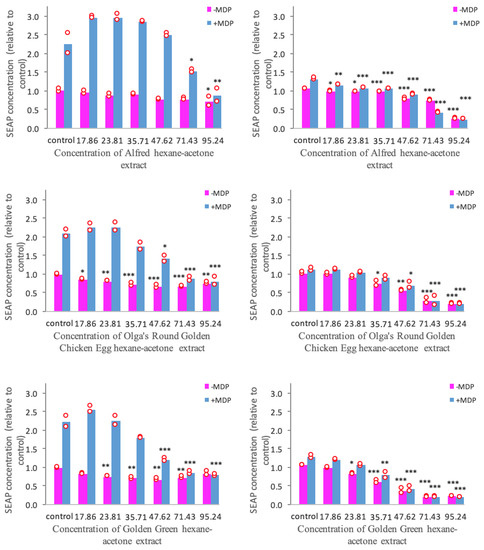 It can be seen from Figure 2 that the hexane-acetone extracts of the Alfred, Olga’s Round Golden Chicken Egg, and Golden Green varieties suppress NOD2-mediated inflammation to different extents. It can be seen that all three tomato extracts were able to suppress the MDP-stimulated SEAP production in NOD2-G908R cells at p < 0.001. However, only the Olga’s Round Golden Chicken Egg and Golden Green extracts were able to suppress the MDP-stimulated SEAP production in NOD2-WT cells at p < 0.001.