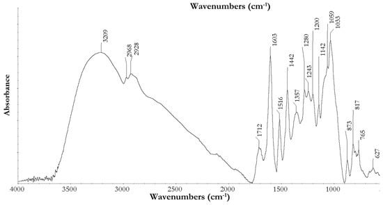 ATR-FTIR analysis of the extract indicated the presence of a mix of hydrolysable and condensed tannins (Figure 1). Hydrolysable tannins, found in grape skins and seeds [,], were identified by the broad peak at 1712 cm−1, attributable to carbonyl stretch, peaks at 1200 cm−1 and 1033 cm−1 of the C–O asymmetric and symmetrical stretching, and peaks at 873 cm−1, 765 cm−1, and 1088–1082 cm−1, which are obscured by the intensity and broadening of the peak at 1030 cm−1. Condensed tannins were identified through shoulders on the broad peaks at 1162–1155 cm−1, 1116–1110 cm−1, 974 cm−1, and 844–842 cm−1. Additionally, the peak at 1516 cm−1, which indicates the presence of non-gallate procyanidins, as a doublet, which is commonly associated with flavanol gallate skeletal stretch of the o-distributed aromatic B-ring, was not observed. Furthermore, there was a C–C–OH deformation of a flavanol heterocyclic ring, as indicated by the doublet at 840–795 cm−1, which also indicates a mixture of tannins in the cis and trans configuration, with trans being predominant, as confirmed by the peak at 1603 cm−1 [].