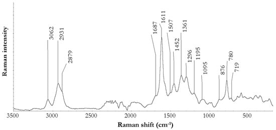 FT-Raman exhibited a number of diagnostic peaks and a generic low intensity of signals, but it provided useful information about the composition of the extract (Figure 2). Several weak signals occurring in the region less than 600 cm−1 were attributable to a combination of C–C and C–O vibrational motions, which can be due to both the heterocyclic C-ring of flavonoid-like structures, and C–O linkages of hydroxyl groups in hydrolysable compounds []. The peak at 719 cm−1 was specifically assigned to the –CH out-of-plane vibrations of the o-substituted aromatic ring of flavonoid compounds, coupled to the 1507 cm−1 weak band due to the in-plane deformation of the B phenyl ring []. The 780 cm−1 peak was probably related to CH out-of-plane deformation of aromatic substituted rings, but the exact attribution is controversial. The 1361 cm−1 peak was reported as a combination band between C–C stretching of aromatic rings and ring deformation vibrations, and the expected related vibration around 1331 cm−1 was shifted to lower frequencies for this sample, at 1296 cm−1 []. Authors attributed this shift to the occurrence of the polymerization process, which decreases the ability of the aromatic quadrant to undergo vibrational deformations, and it has been taken as evidence of the polymerization of phenolic compounds. Several authors agree that a strong peak occurring at around 1611 cm−1 is diagnostic of the presence of phenolic compounds, and it is related to C–CH quadrant stretching modes [,]. A further signal present as a shoulder around 1687 cm−1 was related to combination vibrations, where C=C and C=O moieties are involved; [] the latter is attributable to hydrolysable structures. A noisy spectrum between 1700 and 2000 cm−1 made the recognition of bands occurring for C=O carbonyl and carbonyl ester groups difficult. The peak at 1452 cm−1, coupled with a broad signal centered around 2879 cm−1, could be attributed to the presence of methyl esters; these were assigned to CH bending in the former case, and the stretching of aliphatic CH in the latter []. A further consideration about the extent of polymerization for this extract involves the aliphatic CH stretching (broad band) and the C–O stretching occurring at 1095 cm−1 (weak signal); these peaks are weakened in the case of polymeric structures, as was observed for lignin, [] while there is a relative increase in signal related to aromatic structures, as observed here at 2931 and 3062 cm−1 (CH stretching of aromatic rings), and 1611 cm−1.