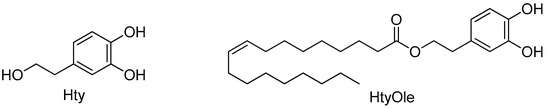 Structure of hydroxytyrosol (Hty) and hydroxytyrosyl oleate (HtyOle).