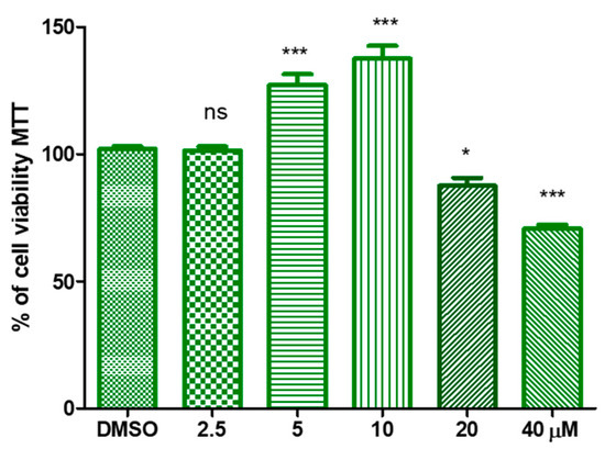 A significant increase in cell vitality was appreciated when HaCat cells were treated with the HtyOle. In particular, a proliferative concentration-dependent action was observed with up to 10 µM of HtyOle, while at 20 and 40 µM cytotoxicity was recorded, as shown in Figure 2.