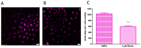 Therefore, we chose the lower effective concentration of HtyOle (5 µM) for further experiments. To investigate HtyOle’s potential modulation of ROS formation, CellRox Deep Red staining was performed. As shown in Figure 3, keratinocytes cultured for 24 h with HtyOle and then exposed to UV (Figure 3B) showed a decrease of stain intensity with respect to the control (Figure 3A). Figure 3C showed the average values of cell area in pixels for red stained keratinocytes.