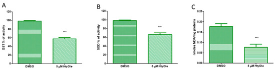 The potential of HtyOle in modulating the antioxidant defenses in human keratinocytes was also investigated. In our experiments, glutathione-S-transferase (GST) and superoxide dismutase (SOD) activities were decreased by HtyOle (Figure 4, panels A and B, respectively). The oxidative degradation of lipids leads to cell damage. Reactive aldehydes, including malondialdehyde (MDA), are the end products of lipid peroxidation [44]. In our experimental set-up, MDA levels decreased upon treatment with 5 µM of HtyOle when compared to control samples (Figure 4C).