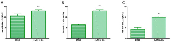 The action of HtyOle on miRs was also investigated to verify whether it can have a skin regeneration potential. Here we tested the following miRs: hsa-miR-34a, hsa-miR-21 and hsa-miR-29a. As shown in Figure 5, up-regulation upon HtyOle treatment was found for hsa-miR-21 (Figure 5B) and hsa-miR-29a (Figure 5C). No significant modulation was recorded for hsa-miR-34a (Figure 5A).