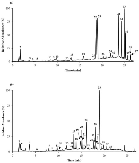 Chromatographic representation of Salvia decoctions at 280 nm: (a) S. apiana; (b) S. farinacea var. Victoria Blue. Numbers in the figure correspond to the UHPLC-DAD-ESI-MSn peaks described in Table 4.