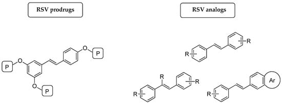 On the other hand, medicinal chemists have focused their efforts on two main goals, which include improvement of the pharmacokinetic properties and/or enhancement of the bioefficacy of trans-RSV [58,59]. Furthermore, because of the quick accessibility of the trans-stilbene scaffold through several synthetic approaches [60,61], as well as the wide range of functionalization that can be performed on phenols, it is no surprise that, so far, a large number of trans-RSV derivatives have been developed and reported in the literature [62,63]. Specifically, trans-RSV derivatives can be divided into two main groups: (1) prodrugs, (2) synthetic analogs. Each group has been developed for addressing different aims, such as to modulate absorption, distribution, metabolism, and excretion (ADME) of trans-RSV (prodrugs), or to enhance its biological and pharmacological activity (trans-RSV analogs). From a structural point of view, RSV prodrugs maintain the 3,5,4′-trihydroxystilbene skeleton in their structure and possess suitable promoiety on the phenolic hydroxyls (Figure 2) [64]. Differently, RSV analogs are derivatives obtained by structural modification on the trans-stilbene core, for example, modification of the double bond or of the benzene ring, phenyl ring substitutions with halogens or other substituents (Figure 2) [62,65,66,67]. Due to the tremendous amount of publications regarding the trans-RSV derivatives and the specific scope of this review, here we mainly focus on the description of RSV prodrugs and technological approaches involving RSV incorporation into different delivery systems.