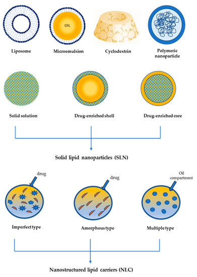 To overcome the drawbacks of liposomes and polymeric nanoparticle while merging their positive features, at the beginning of the 1990s, solid lipid nanoparticles (SLN) were developed [78,79,80]. The great potential of these novel carriers in the development of successful drug delivery systems was immediately realized owing to their many positive features such as ability to incorporate lipophilic and hydrophilic drugs improving their stability and bioavailability, improved drug water solubility, controlled drug release and targeting, safety, biocompatibility, low cost of production and easy scale-up. SLN are aqueous colloidal systems consisting of a solid lipid core that is stabilized by a suitable mixture of surfactants. The SLN preparation method can lead to a different drug distribution in the lipid matrix, generating three types of SLN [81]. In the “solid solution” model, the drug is molecularly dispersed in the lipid matrix, while in the “core-shell” and in the “drug-enriched shell” model, the drug is preferentially incorporated in the core or in the shell, respectively (Figure 3). Unfortunately, due to the crystalline structure of the lipid core, SLN exhibited to main drawbacks: (a) low drug loading, (b) drug leakage during storage. To improve such unfavorable properties of SLN, a second generation of lipid nanoparticles was developed using mixtures of solid and liquid lipids to prevent the formation of a crystalline lipid core. Such lipid nanoparticles, defined as nanostructured lipid carriers (NLC), can show different structures, depending on the type of lipids and the method used for their preparation. As depicted in Figure 3, three types of NLC can be obtained: amorphous type, imperfect type and multiple type [79]. Amorphous type NLC contain a solid amorphous matrix made up of a mixture of solid lipid and specific liquid lipids (medium chain triglycerides or isopropyl myristate). The imperfect type is prepared using a blend of spatially different lipids that lead to the presence of imperfections in the matrix that can host the drug in amorphous clusters. The multiple type NLC contain oil compartments in which the drug can be easily solubilized. Due to the previously mentioned structures, NLC show greater drug loading and better stability in comparison to SLN.