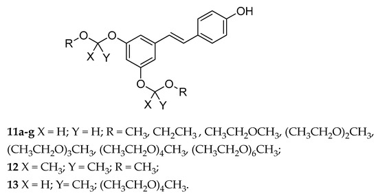 A series of RSV prodrugs, in which the acetal groups were used to link the phenolic hydroxyls with short ethylene glycol oligomers (OEG), was described in 2013 (Figure 7) [128]. In this set, compounds with four or six ethylene glycol (EG) units showed better solubility in water than the compounds containing three units, with an improvement of the pharmacokinetic properties of RSV. However, adsorption was also affected by the nature of acetals. Specifically, compounds with two hydrogens as substituent were too stable (11a-g), as only the prodrugs were detected in the blood. On the other hand, the compound with two methyls as substituent (12) gave opposite results. Finally, the compound with one hydrogen and one methyl (13) gave good results in term of protracted regeneration of the parent molecule after its absorption, although this result was lower than that of RSV [128].