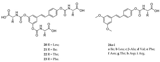 Similar results were obtained with amino acid carbamates [132]. This new set of RSV derivatives possessed a natural amino acid moiety (i.e., Leu, Ile, Phe, and Thr, respectively) attached by carbamoyl linker (20–23, Figure 11). In this work, the new prodrugs showed, once again, good resistance to hydrolysis in aqueous media and blood, confirming that carbamates are suitable as a capping groups to obtain RSV prodrugs. However, in this specific case, the presence of an extremely hydrophilic promoiety, such as an amino acid, led to insufficient absorption of the derivatives. The authors suggested that one of the reason for the failure in passing the inner membrane might be the large and ramified structure of the molecules that did not allow them to be carried by transporters [132]. To overcome this issue, another series of amino acid carbamates, in which the 3,5-dimethoxy-RSV (pterostilbene) was used as a starting material, has been synthesized in 2017 [133]. Specifically, the metabolic soft spot of pterostilbene (the 4′-position) was masked by a carbamoyl bond-based amino acid group (24a–i, Figure 11). The new set of RSV derivatives were readily absorbed after intragastric administration in rats, and among them, compound 24a (incorporating isoleucine) showed an optimal pharmacokinetic profile. Further characterization of 24a showed that after several hours from its administration, the absorption and concentration of pterostilbene were higher than that of pterostilbene administrated as such. Moreover, further studies performed on an in vitro model of human intestinal absorption revealed that, unlike 17–19, compound 24a could cross the apical membranes either through passive diffusion or by an active transport mechanism [133].