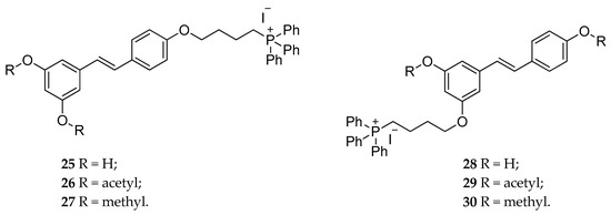 New conjugated derivatives of RSV or RSV diacetate with a triphenylphosphonium group (TPP) were synthesized (25 and 26, Figure 12), to increase the pro-oxidant action of RSV on mitochondria [134]. The presence of a membrane-permeable lipophilic cation, like TPP, drove the molecule to the mitochondrial matrix, which had a negative potential. Among them, 26 showed a fast-growing cytotoxicity effect on murine colon cancer cell line [134]. Subsequently, Sassi et al. synthesized and characterized different analogs, bearing the TPP group at 4′- and 3-position (27–30, Figure 12) [135]. The cytotoxicity of the new derivatives was higher for the methylated ones, and the cell death was mainly of the necrotic type and was due to the H2O2 production upon the accumulation of the compounds into mitochondria. It is worth noting that RSV at the same dose range (low μM) did not show any effect, confirming that the accumulation in mitochondria was due to the presence of TTP group [135]. Moreover, further studies on the mechanism of generation of reactive oxygen species (ROS) and mitochondrial depolarization suggested an interaction with the respiratory chain complexes, which might cause superoxide production by these agents. The authors also speculated about the possibility for these derivatives to involve the ATP synthase into a conduit for uncoupled proton translocation [136].
