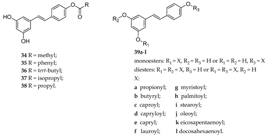The combination of two different active moieties within the same molecule represents an attractive strategy to exert a synergic effect and avoid drug-drug interactions [137,138,139,140]. Bernhaus et al. synthesized the 3,5-O-digalloylresveratrol (DIG) 31 [141], a diester of RVS with the gallic acid (Figure 13), a natural product compound showing pro-apoptotic properties against various tumor cell lines [142,143,144]. In this study, the biological effects of 31 in HT-29 human colon cancer cells were observed. Treatment of the cancer cells line for 72 h with 40 µM of 31 produced a dose-dependent apoptotic effect (45% of cells). Interestingly, 31 inhibited the growth of HT-29 cells more effectively than the combination of RSV and gallic acid in a ratio of 1:2. Moreover, the anticancer properties of 31 were supported by its inhibitory effect observed on ribonucleotide reductase. Specifically, 31 produced arrest of the G0–G1 cell cycle and depletion of S and G2-M phase cells in HT-29 tumor cells. Finally, simultaneous treatment with 31 and 5-FU (an established drug for colon cancer), enhanced the growth inhibitory effects in HT-29 cells. Unfortunately, the in vitro stability studies performed on 31 showed its rapid hydrolysis into RSV [141].