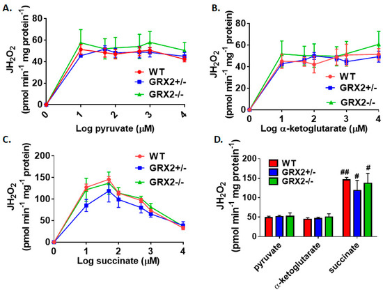 Deletion of the Grx2 gene does not alter the rate of H2O2 production by liver mitochondria isolated from female mice. Rates of production by mitochondria energized with pyruvate (A), α-ketoglutarate (B), or succinate (C) at a concentration range of 10–10,000 µM. (D). Comparison of the rates of reactive oxygen species (ROS) production in mitochondria isolated from wild-type (WT), GRX2+/−, and GRX2−/− mice oxidizing 50 µM pyruvate, α-ketoglutarate, or succinate. n = 4, mean ± SEM (standard error of mean), 2-way ANOVA with a post-hoc Tukey’s test. #: p ≤ 0.05, ##: p ≤ 0.01.