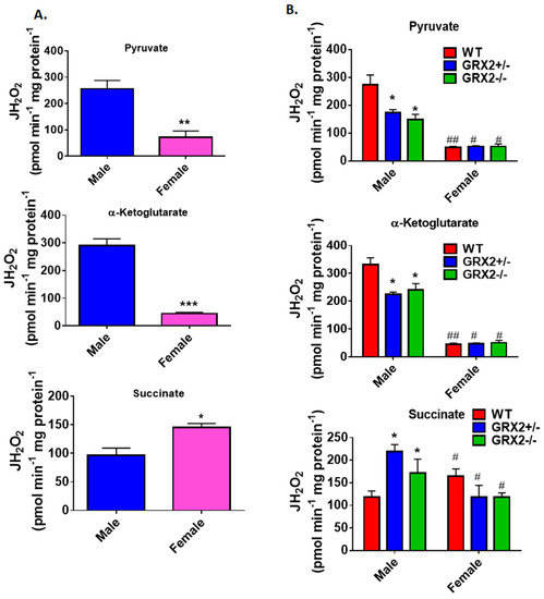 Next, the impact of mouse sex on ROS production in liver mitochondria prepared from GRX2+/− and GRX2−/− mice was examined. First, it was found that liver mitochondria from female mice displayed significantly lower rates for ROS production when oxidizing pyruvate or α-ketoglutarate, regardless of genotype (Figure 2B). Secondly, loss of GRX2 impacted ROS production in liver mitochondria from male mice only. Indeed, liver mitochondria from male mice heterozygous and homozygous for the Grx2 gene generated significantly less H2O2 when compared to male WT littermates when pyruvate and α-ketoglutarate served as the substrate (Figure 2B). In contrast, no differences were observed in liver mitochondria prepared from GRX2-deficient and WT female mice. We also examined the impact of sex and genotype on ROS production in the presence of succinate. First, liver mitochondria from WT female mice generated significantly more ROS than their male WT counterparts (Figure 2B). The second critical observation made was that there was a genotype effect in male mice only. Indeed, liver mitochondria from male GRX2+/− and GRX2−/− mice displayed a significant increase in the rate of H2O2 production (Figure 2B). However, no such effect was observed in liver mitochondria isolated from female littermates (Figure 2B). These revelations indicate that there is a sexual dimorphism associated with the GRX2-mediated regulation of ROS production in male and female liver mitochondria.
