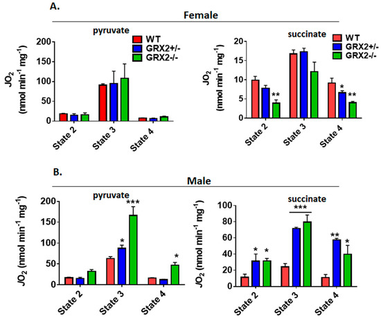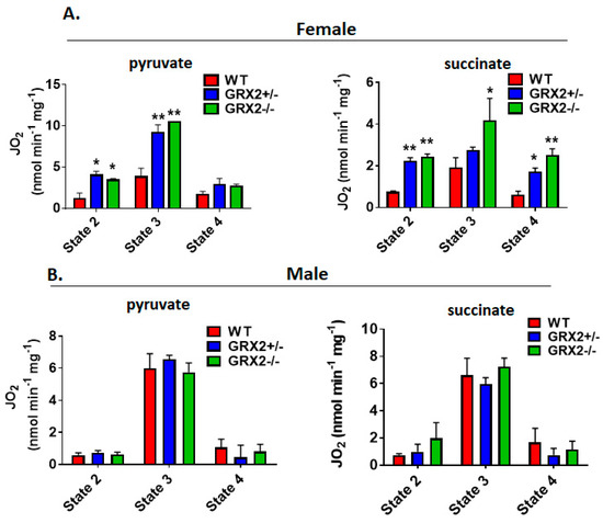 Polarographic measurement of the rate of O2 consumption by liver mitochondria isolated from female and male GRX2-deficient mice and WT littermates. (A). Assessment of the three respiratory states of mitochondria from female mice oxidizing pyruvate (10 mM) and malate (2 mM) or succinate (5 mM). (B). Assessment of the three respiratory states of mitochondria from male mice oxidizing pyruvate (10 mM) and malate (2 mM) or succinate (5 mM). n = 4, mean ± SEM, 1-way ANOVA with a post-hoc Tukey’s test. *: p ≤ 0.05, **: p ≤ 0.01.