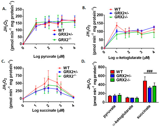 Deletion of the Grx2 gene does not alter the rate of H2O2 production by muscle mitochondria isolated from female mice. Rates of production by mitochondria energized with pyruvate (A), α-ketoglutarate (B), or succinate (C) at a concentration range of 10–10,000 µM. (D). Comparison of the rates of ROS production in mitochondria isolated from WT, GRX2+/−, and GRX2−/− mice oxidizing 50 µM pyruvate, α-ketoglutarate, or succinate. n = 4, mean ± SEM, 2-way ANOVA with a post-hoc Tukey’s test. ###: p ≤ 0.001